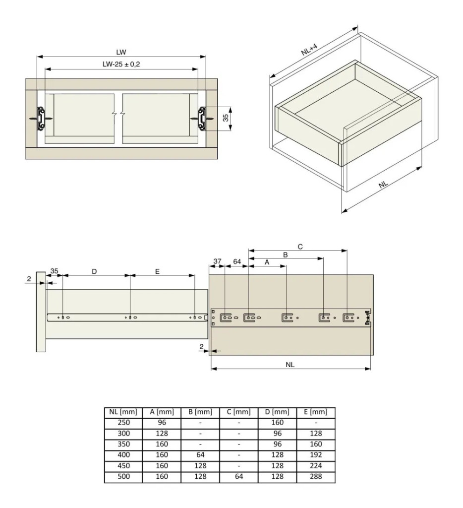 Teljes kihúzású fióksín csillapítás nélkül fa fiókokhoz. A belső fióktámasz eltávolítható a fiók egyszerűbb szerelése érdekében. A fióksín gumiütközővel van felszerelve a sima és csendes záródás érekében.