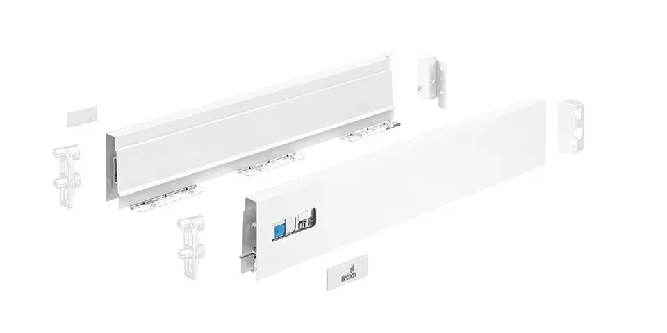 InnoTech Atira vasalat belső fiókra fehér színben, a fiók mélysége 620mm, az oldalfal magassága 70mm, a fióksín teherbírása 50kg, fogantyú nélküli nyitás és Push to open silent (P2Os) csillapítás a zárásnál. A szett tartalmaz: 1 pár fióksín, 1 pár oldalfal, 2 db front lemez rögzítő, 2 db takarósapka Hettich logóval, 1 pár hátlap tartó . Mindig a megfelelő modullal és alumínium front profillal kell kiegészíteni 294940 (hossz 2000mm, magasság 70mm, rövidítés = a korpusz belső szélessége - 2x10, 5 - 57, 5). 600 mm-nél szélesebb fióknál szinkronizációs rúddal kell kiegészíteni 318279 (hossz 2000mm, rövidítés = a korpusz belső szélessége - 2x EB - 66mm).