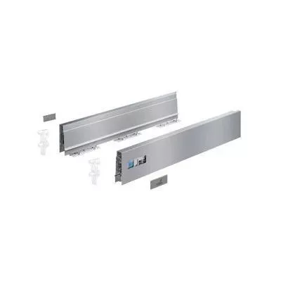 Vasalat InnoTech Atira frontkihuzású fiókhoz ezüst színben, a fiók mélysége 420mm, az oldalfal magassága 70mm, a fióksín teherbírása 30kg, fogantyú nélküli nyitás és Push to open silent (P2Os) csillapítás a zárásnál. A szett tartalmaz: 1 pár fióksín, 1 pár oldalfal, 2 db frontvasalat (tipli), 2 db takarósapka Hettich logóval, 1 pár hátlap tartó . Mindig a megfelelő P2Os modullal kell kiegészíteni ( a csomagolás adaptereket tartalmaz a szinkronizációs rúd rögzítésére). 600 mm-nél szélesebb fióknál szinkronizációs rúddal kell kiegészíteni 318279 (hossz 2000mm, rövidítés = a korpusz belső szélessége - 2x EB - 66mm).