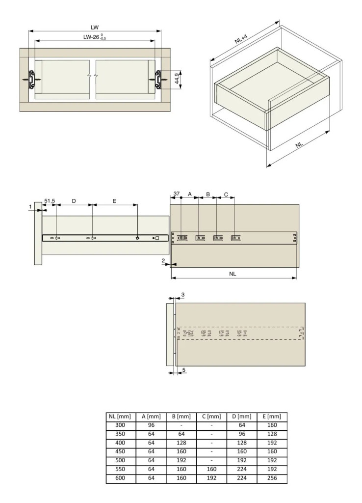 45 mm golyós fióksín teljes fiókkávás fiókokhoz. Teljes kihúzású, azaz a kihúzás hossza ugyanaz, mint a fióksín névleges hosszúsága. Szilárd és tartós fióksín, az anyagvastagságok 1,2-1,2-1,5 mm. Nyomásra nyíló mechanizmus (push-to-open). Az egyszerű szerelhetőség érdekében a fiókprofil elválasztható a fiók többi részétől, rácsavarozható a fiókra, majd visszatolható.