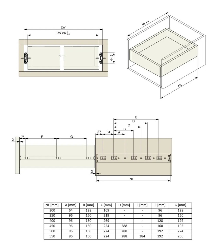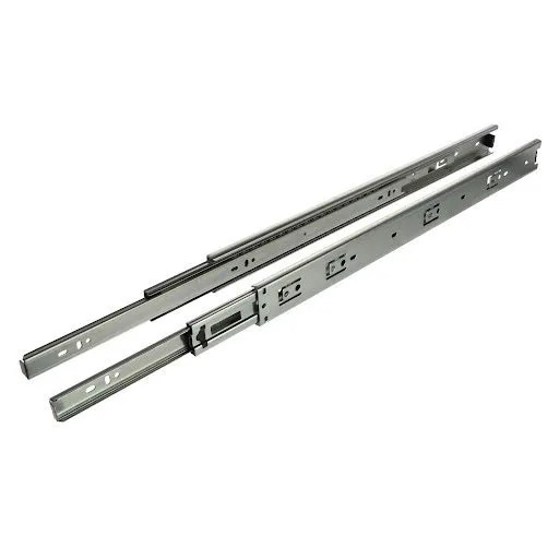 Full extension ball bearing slide for installation on wooden drawer. Inner drawer bar can be removed for easier installation of the drawer. The slide has a rubber stop buffer.