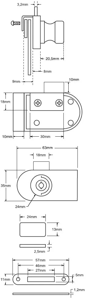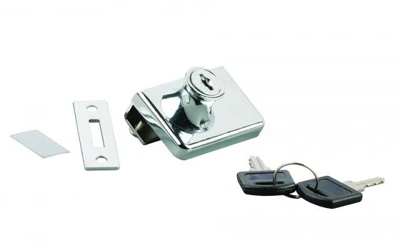 Csúszó zár két nyitható üveghez A készlet tartalmaz: retesz, 2 db M4 csavar, 1 db műanyag alátét, 1 db ellentétes elem a testhez, 2 db kulcs | 4 - 8 mm vastagságú üveghez